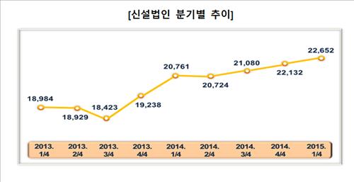 (서울=연합뉴스) 홍지인 기자 = 중소기업청은 올해 1분기 신설법인이 지난해 같은 기간보다 9.1%(1천891개) 증가한 2만2천652개로, 분기 기준 역대 최대치를 기록했다고 29일 밝혔다.