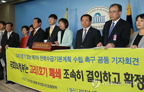 | △ (서울=연합뉴스) 진성철 기자 = 29일 국회 정론관에서 부산경남지역 여야 의원들과 고리1호기폐쇄 부산범시민운동본부 회원들이 '국회와 정부는 고리1호기 폐쇄 조속히 결의하고 확정하라'고 촉구하고 있다. 2015.4.29 zjin@yna.co.kr |