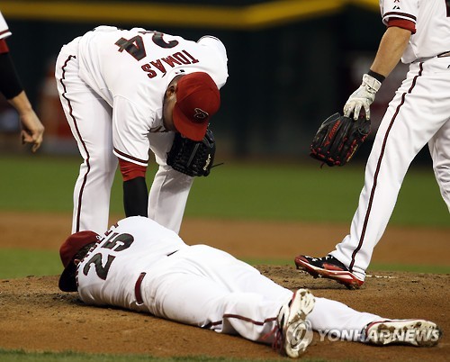 | △ 미국 프로야구 애리조나 다이아몬드백스 투수 아치 브래들리가 마운드에 쓰러져 있다.(AP=연합뉴스) |