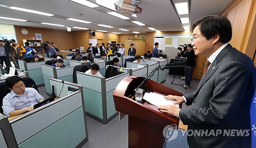 | △ 세월호 특별법 시행령 수정안 설명하는 김영석 해수차관 (세종=연합뉴스) 배재만 기자 = 김영석 해양수산부 차관이 29일 오후 정부세종청사 해수부 기자실에서 세월호 특별법 시행령 수정안에 대해 설명하고 있다. |