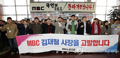 | △ MBC 노동조합이 2012년 4월 17일 서울 여의도 MBC에서 기자회견을 열고 구호를 외치고 있다. |