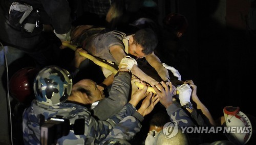 (신두팔촉<네팔>·서울=연합뉴스) 나확진 특파원 백나리 기자 = 대지진이 강타한 네팔 카트만두의 구조 현장에서 무너진 건물에 갇혀 82시간을 버틴 20대 남성이 기적적으로 구조됐다.