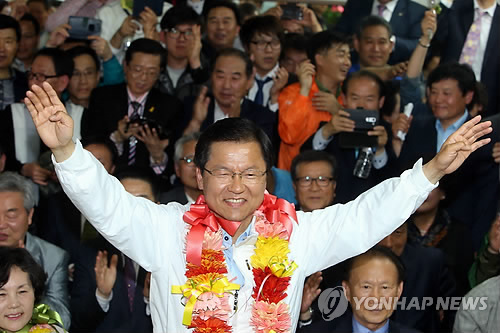 | △ 돌아온 천정배 (광주=연합뉴스) 형민우 기자 = 4·29 광주 서구을 보궐선거에 출마한 무소속 천정배 후보가 29일 오후 광주 서구 금호동 선거사무소에서 당선이 확실시되자 두 손을 번쩍 들어 환호하고 있다. |