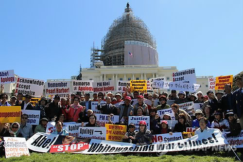 | △ 일본군 위안부 피해자인 이용수 할머니와 워싱턴DC와 버지니아, 메릴랜드 등 인근 지역의 한·미·중 시민단체는 아베 신조 일본 총리의 연설을 하루 앞둔 28일(현지시간) 미 의사당 앞에 모여 아베 총리의 그릇된 역사관을 한목소리로 규탄하고 있다. |