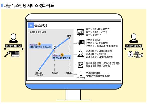 (서울=연합뉴스) 윤보람 기자 = 다음카카오[035720]는 자사가 운영하는 크라우드펀딩 서비스 '뉴스펀딩'이 출시 반년 만에 누적 후원금 10억원을 돌파했다고 30일 밝혔다.