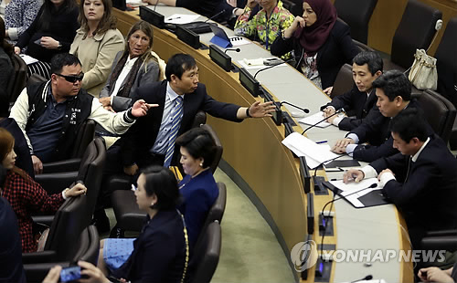 (유엔본부=연합뉴스) 박성제 특파원 = 북한의 유엔대표부 직원들이 30일(현지시간) 미국 뉴욕 유엔본부에서 열린 '북한 인권' 관련 행사의 진행을 방해하는 국제적인 추태를 보였다.