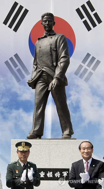 | △ 우뚝 선 안중근 장군 동상 (서울=연합뉴스) 윤동진 기자 = 1일 오전 서울 노원구 육군사관학교에서 박승춘 국가보훈처장(오른쪽)과 양종수 육군사관학교장이 안중근 장군 동상 제막식을 한 뒤 박수를 치고 있다. mon@yna.co.kr |