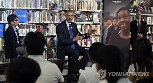오바마 대통령은 30일(현지시간) 워싱턴 인근의 한 도서관에 들러 학생들에게 자신이 어렸을 때부터 지금까지 재밌게 읽었던 책들을 소개했다.