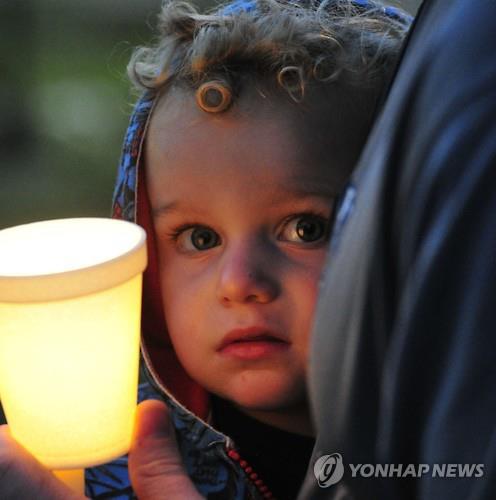 | △ (AP=연합뉴스) 지난달 30일 미국 앨라배마주 헌츠빌에서 열린 네팔 지진 희생자 추모 집회에서 한 아기가 촛불을 든 아빠 품에 안겨 있다. |