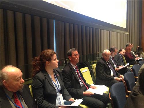 | △ (유엔본부=연합뉴스) 이강원 특파원 = 1945년 8월 일본 히로시마와 나가사키에 원자폭판 투하가 있은지 70년이 흐른 1일(현지시간) 미국 뉴욕 소재 유엔본부에서는 한국인 원폭피해자 문제가 유엔 차원에서 처음으로 제기돼 눈길을 끌었다. 유엔본부에서 올해로 9번째를 맞은 `핵확산금지조약(NPT) 재검토 회의'에서 한국인 피폭자와 한국 시민·사회단체는 유엔 차원에서는 처음으로 '일본내 한국인 피폭자' 문제를 제기했다. 사진은 이날 한국인 피폭자 문제를 제기한 일본 히로시마 원폭 한국인 피해자 심진태(72)씨의 모습(왼쪽에서 3번째) |