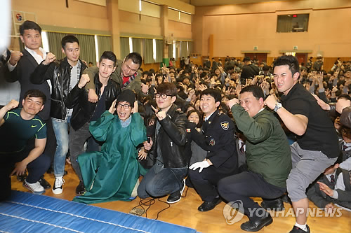 | △ (부산=연합뉴스) 김선호 기자 = 부산경찰청이 30일 오후 부산시 부산진구 동양중학교 대강당에서 연 '부산사나이 프로젝트' 학교폭력예방 이벤트에서 개그맨 윤형빈 씨와 경찰관들이 학교폭력 근절 파이팅을 외치고 있다.. 2015.3.30 wink@yna.co.kr |