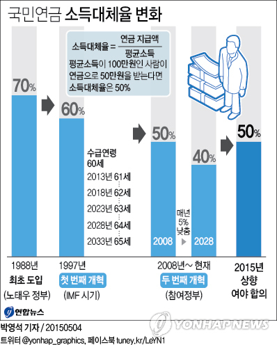 (서울=연합뉴스) 김병규 기자 = 여야가 국민연금의 소득대체율을 40%에서 50%로 끌어올리기로 합의하면서 소득대체율의 적정성에 대한 관심이 높아지고 있다.