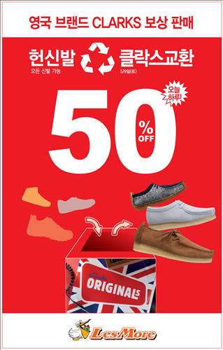 9일 브랜드에 관계없이 헌 신발을 가져오는 고객을 대상으로 클락스 신발을 50% 할인 판매한다.