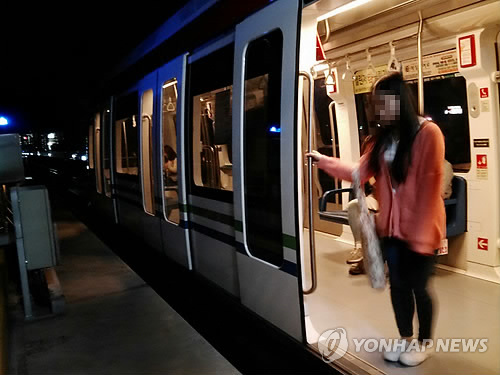 | △ 의정부경전철 신호 이상으로 전 구간 운행 중단 (의정부=연합뉴스) 임병식 기자 = 4일 오후 9시 35분께 경기도 의정부경전철 전 구간 운행이 중단되자 비상 밸브를 작동해 열린 출입문으로 통해 한 승객이 내리고 있다. 2015.5.4 andphotodo@yna.co.kr |
