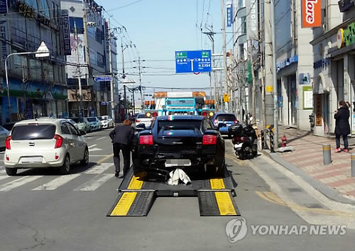 | △ 거제 추돌 사고 현장의 람보르기니 (거제=연합뉴스) 지난 14일 경남 거제시 고현동에서 SM7 차량이 추돌한 람보르기니 차량이 견인되는 모습. 2015.3.20 <<독자 제공>> pitbull@yna.co.kr |