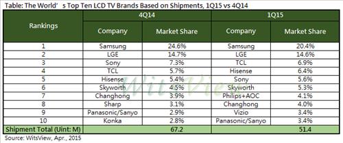 5일 시장조사업체 위츠뷰(WitsView)에 따르면 2015년 1분기 세계 10대 LCD TV 업체의 출하량은 5천140만 대로 작년 4분기(6천720만 대)보다 23.5% 감소했다.