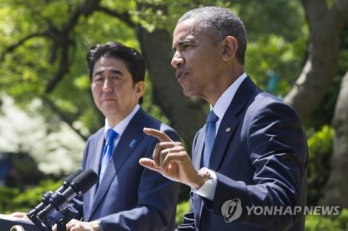 | △ 버락 오바마(오른쪽) 미국 대통령과 아베 신조 일본 총리의 공동 기자회견(EPA=연합뉴스) |