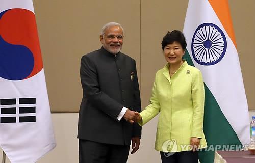 | △ 지난해 11월 12일 미얀마 국제회의센터(MICC)에서 열린 한-인도 정상회담에서 박근혜 대통령과 나렌드라 모디 인도 총리가 악수하고 있다.(연합뉴스 자료사진) |