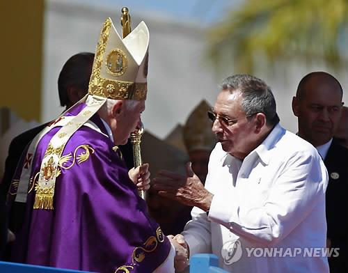 | △ 2012년 3월 교황 베네딕토 16세가 쿠바 수도 아바나를 방문해 미사를 집전할때 라울 카스트로 쿠바 국가평의회 의장과 악수를 하고 있는 모습.(AP=연합뉴스DB) |