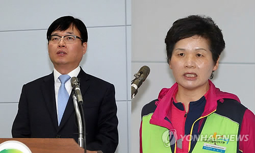 | △ 청주시노인병원 결국 폐업 (청주=연합뉴스) 김형우 기자 = 청주시노인전문병원 민간위탁운영자인 한수환(왼쪽) 씨엔씨재활요양병원장이 6일 오전 청주시청 브리핑실에서 기자회견을 했다. 이 자리에서 그는 "2012년 1월부터 제가 위탁 운영한 시노인전문병원을 다음 달 10일 자로 폐업하고 의료기관 개설 허가증을 시에 반납할 것"이라고 밝혔다. 민주노총 공공운수노조 의료연대충북지부 청주시노인전문병원분회 권옥자(오른쪽) 분회장은 "한 원장이 무책임하다"며 그를 비판했다. 2015.5.6 vodcast@yna.co.kr |