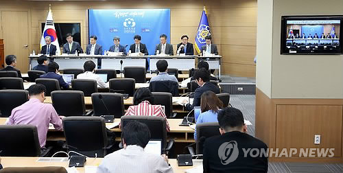| △ 규제개혁장관회의 관련 정부 합동 사전 브리핑 (세종=연합뉴스) 배재만 기자 = 권평오 산업통상자원부 무역투자실장(오른쪽에서 두 번째)을 비롯한 정부 관계부처 담당자들이 정부세종청사 1동 브리핑룸에서 규제개혁장관회의와 관련한 사전 브리핑을 열고 있다. 왼쪽부터 강봉한 식품의약품안전처 의료기기안전국장, 맹성규 국토교통부 교통물류실장, 정병윤 국토교통부 국토도시실장, 강영철 국무조정실 규제조정실장, 이정원 국무조정실 규제혁신기획관, 강성주 미래창조과학부 인터넷융합정책관, 권평오 산업통상자원부 무역투자실장, 정지원 금융위원회 상임위원. |