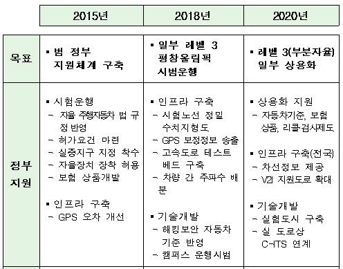 정부는 자율주행차를 2020년 3단계 수준으로 상용화하되 인프라가 완벽하지 않을 수 있다고 보고 운전자의 주된 통제 하에서만 또는 고속도로 등 일정 구간에서만 운영에 들어간다는 계획이다.