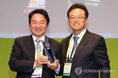 | △ (제주=연합뉴스) 원희룡(왼쪽) 제주지사가 6일 경기도 킨텍스에서 열린 세계전기자동차협회(WEVA) 주최 제28차 세계 전기자동차 국제학술대회 및 전시회(EVS28) 개막식에 참석, WEVA 선우명호(오른쪽) 회장으로부터 E-Visionary Award(전기차 모범도시상)를 받고 함께 기념촬영을 하고 있다. 2015.5.6 <<제주도 제공>> khc@yna.co.kr |