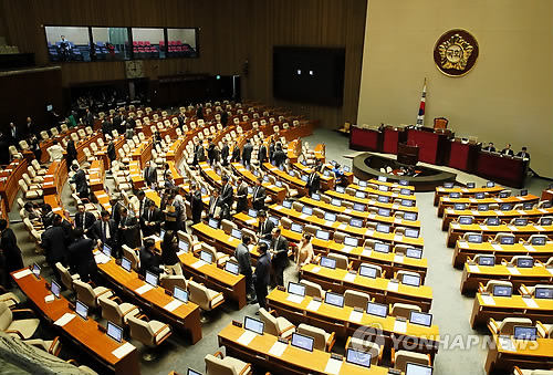 | △ 공무원연금 개혁안 4월 임시국회 처리 무산 (서울=연합뉴스) 진성철 기자 = 4월 임시국회에서 공무원연금 개혁안 처리가 무산된 6일 밤 새누리당 의원들이 국회 본회의장을 떠나고 있다. |