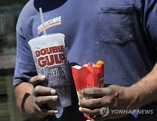 | △ (AP=연합뉴스) 미국 뉴욕주 대법원이 26일(현지시간) 대용량 탄산음료 판매를 금지하려는 뉴욕주의 계획을 하급심과 마찬가지로 받아들이지 않았다. 뉴욕주 대법원은 이날 뉴욕시 보건국이 대용량 탄산음료의 판매 규제를 승인한 것이 법적 권한을 벗어났다는 취지로 이같은 판결을 내렸다. 사진은 2012년 5월 뉴욕에서 한 남성이 커다란 탄산음료를 들고 편의점을 나서는 모습. FILE - In this May 31, 2012 file photo, a man leaves a 7-Eleven store with a Double Gulp drink, in New York. The New York Court of Appeals ruled Thursday, June 26, 2014 that the city's health department overstepped its bounds when it restricted the size of sodas. The court is siding with a lower court that overturned the 2012 ban. (AP Photo/Richard Drew, File) |