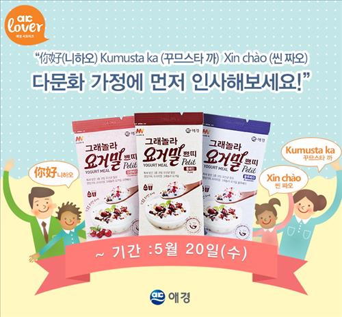 애경은 추첨으로 50명을 선정해 애경 생활용품을 전달하고, 선정된 고객 1명당 2곳의 다문화가정에 당첨자 이름으로 헬스앤 그래놀라 요거밀 쁘띠 2세트(3주 분량)를 전달한다.