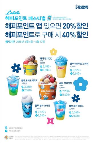 (서울=연합뉴스) 고유선 기자 = 던킨도너츠는 해피포인트로 구매하는 고객에게 40%, 해피포인트 애플리케이션을 제시하는 고객에게 20% 할인 혜택을 주는 행사를 17일까지 진행한다.