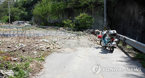 | △ "도로야? 밭이야?" (수원=연합뉴스) 강창구 기자 = 수원시 장안구 송죽동 산 423의 1 광교산 진입도로를 인근 주민이 흙으로 덮은 뒤 농사를 짓고 있다. 주민들은 인도가 없어 통행에 큰 불편을 겪고 있다. 2015.5.7 kcg33169@yna.co.kr |