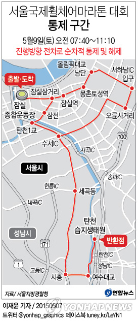 (서울=연합뉴스) 임기창 기자 = 서울지방경찰청은 주말인 9일 서울 송파구와 경기 성남시 일대에서 열리는 제23회 서울국제휠체어마라톤대회로 코스 주변 도로의 차량 통행이 통제된다며 우회로를 이용하라고 7일 당부했다.