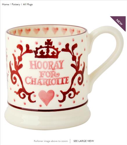 또다른 도자기 회사 에마 브리지워터도 '공주님이에요' '샬럿 공주 만세'라는 문구와 핑크색 하트 및 왕관 문양을 넣은 크림색 머그컵을 선보였다.