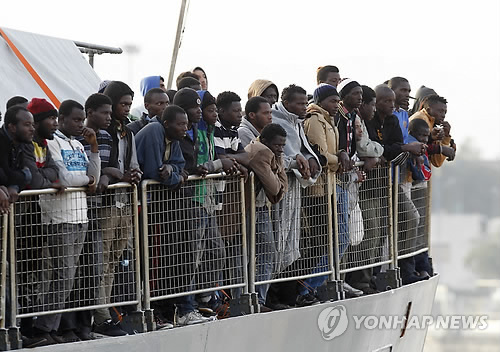 | △ (시칠리아 AP=연합뉴스) 아프리카 이주자들이 6일(현지시간) 이탈리아 시칠리아 메시나 항의 아이슬란드 경비함정에서 하선 대기하고 있다. 지난 주말 등 3일간 리비아에서 지중해로 고무보트와 어선에 실어보낸 난민 가운데 약 7천명이 구조됐다고 해안경비 당국이 보고했다. |