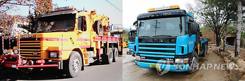 | △ (부산=연합뉴스) 차령이 30년이 넘은 특수구난용 대형 렉카(왼쪽)의 외형이 최신 모델처럼 불법 개조돼 영화 '페이스 오프'를 연상하게 한다. 2015.5.7 << 부산지방경찰청 제공 >> youngkyu@yna.co.kr |