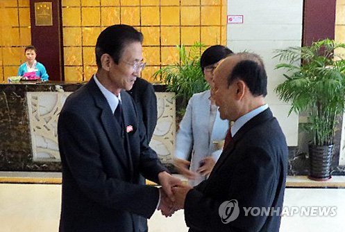 | △ 6·15 공동선언 발표 15주년 공동행사를 위한 남북 민간 차원의 사전 논의가 시작된 5일 중국 선양 한 호텔에서 남과 북 측 준비위원회 대표단이 만나 인사를 나누고 있다. 왼쪽은 북측 대표인 김완수 6·15공동선언실천 북측위원회 위원장, 오른쪽은 남측 대표인 이창복 상임대표의장. |