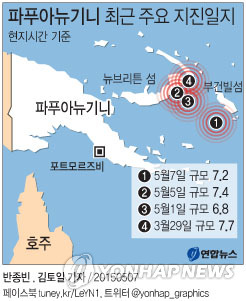 (시드니=연합뉴스) 김기성 특파원 = 최근 지진 활동이 매우 활발한 남태평양 섬나라 파푸아뉴기니 근해에서 7일 오후 규모 7.1의 지진이 또 발생했다.