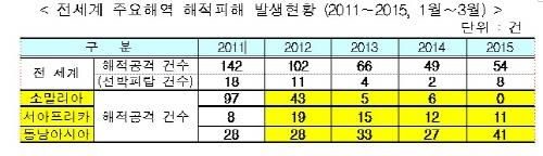 한국 선박의 피랍사건은 2011년 이후 지금까지 없고 올해 1분기 한국 선박의 해적피해 신고도 없다.