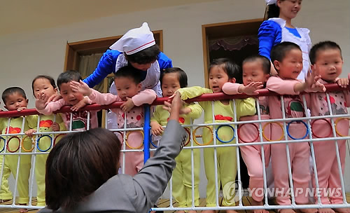 | △ WFP사무총장에게 인사하는 北 육아원 원아들 (서울=연합뉴스) 북한 평안남도 평성시의 한 육아원 원아들이 세계식량계획(WFP)의 어서린 커즌 사무총장과 인사하고 있다. WFP는 북한에서 모자(母子) 영양지원 사업을 펴고 있으며 커즌 사무총장은 지난 19∼21일 북한을 방문했다. 2014.5.24 <<WFP/Marco Frattini 제공>> photo@yna.co.kr |