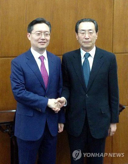 | △ 황준국 외교부 한반도평화교섭본부장(왼쪽)과 우다웨이(武大偉) 중국 외교부 한반도사무특별대표가 지난 6일 중국 베이징(北京)에서 한중 6자회담 수석대표 회담을 개최했다. 2015.5.7 << 주중대사관 제공 >> |