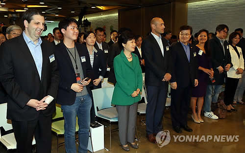 | △ ‘구글 캠퍼스 서울’ 개소식 참석한 박 대통령 (서울=연합뉴스) 도광환 기자 = 박근혜 대통령이 8일 오전 서울 강남구 역삼동에서 열린 ‘구글 캠퍼스 서울’ 개소식에 참석, 착석하려 하고 있다. 박 대통령은 오른쪽은 카림 템사마니 구글 아태지역 총괄. dohh@yna.co.kr |