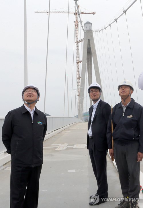 | △ 고군산군도 연결도로 현장 찾은 국토교통부 장관 (군산=연합뉴스) 김동철 기자 = 유일호 국토교통부 장관이 8일 오후 전북 군산시 고군산군도 연결도로 현장을 찾아 현장을 둘러보고 있다. 2015.5.8 sollenso@yna.co.kr |