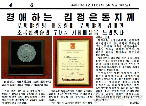 | △ 러시아 푸틴, 김정은에게 전승절 기념메달 보내 (서울=연합뉴스) 북한 노동당 기관지 노동신문은 러시아 블라디미르 푸틴 대통령이 지난 8일 김정은 국방위원회 제1위원장에게 조국전쟁승리 70주년 기념 메달을 보냈다고 9일 보도했다. 평양에서 열린 전달식에서는 알렉산드르 마체고라 북한 주재 러시아 대사가 위임을 받아 양형섭 최고인민회의 상임위원회 부위원장에게 메달을 전달했다. 2015. 5. 9 nkphoto@yna.co.kr |