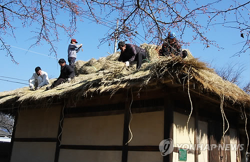 | △ 겨울채비하는 정지용 생가 (옥천=연합뉴스) 충북 옥천군 옥천읍 정지용(鄭芝溶) 시인의 생가에서 19일 초가지붕의 이엉을 교체하는 작업이 한창이다. 2014.11.19 <<옥천군 제공>> bgipark@yna.co.kr |