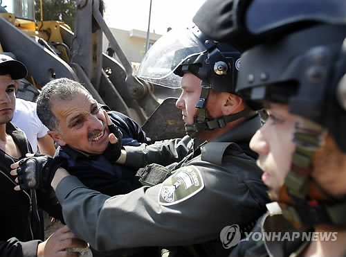 | △ 6일(현지시간) 이스라엘이 요르단강 서안지구 헤브론 인근의 소바 마을에 살고 있는 팔레스타인인 주택들을 강제 철거하자 한 팔레스타인 남성이 이에 항의하며 이스라엘 경찰과 몸싸움을 벌이고 있다.(자료사진) |