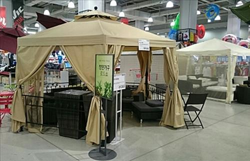 카페 분위기를 연출할 수 있는 '홀딩 파라솔'을 14만9천900원, 1인용 소파와 탁자 등으로 구성된 '라탄 테이블 세트'를 129만9천원에 내놓는다.