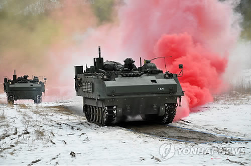 | △ 국내 기술로 개발한 신형 화생방정찰차 (서울=연합뉴스) 국내 기술로 개발된 신형 화생방정찰차의 모습. 방위사업청은 11일 국내 방산업체 두산DST가 개발한 화생방정찰차가 시험 평가 결과 '전투용 적합' 판정을 받았다고 밝혔다. 신형 화생방정찰차는 국방과학연구소에서 개발한 원거리 화학 자동경보기와 화생 겸용 자동탐지기를 탑재해 작전 성능이 크게 개선됐다. 화생방정찰차를 자체적으로 개발한 국가는 미국과 독일에 이어 한국이 세 번째다. 2015.5.11 <<방위사업청 제공>> photo@yna.co.kr |