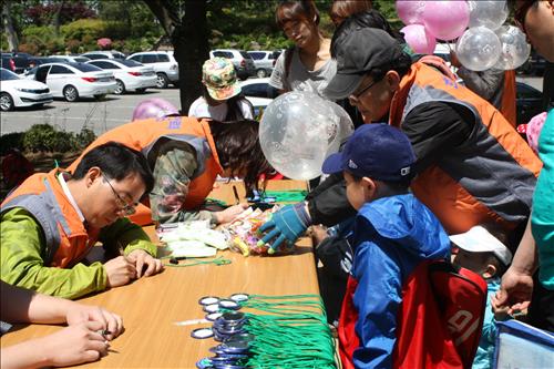 | △ 한국전력 사회봉사단원들이 지난 5일 어린이날 진행한 '미아예방 캠페인'에 참가해 어린이들에게 목걸이형 이름표와 아동실종예방 수첩을 나눠줬다. |