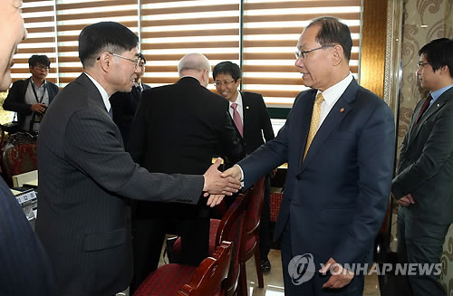 | △ 황우여, 대전·충남·세종지역 대학 총장 오찬간담회 (세종=연합뉴스) 배재만 기자 = 황우여 사회부총리 겸 교육부 장관이 11일 낮 정부세종청사 인근 한 음식점에서 구기헌 상명대 총장(왼쪽) 등 대전·충남·세종지역 대학 총장 23명과 오찬간담회를 하기 앞서 인사하고 있다. 2015.5.11 scoop@yna.co.kr |
